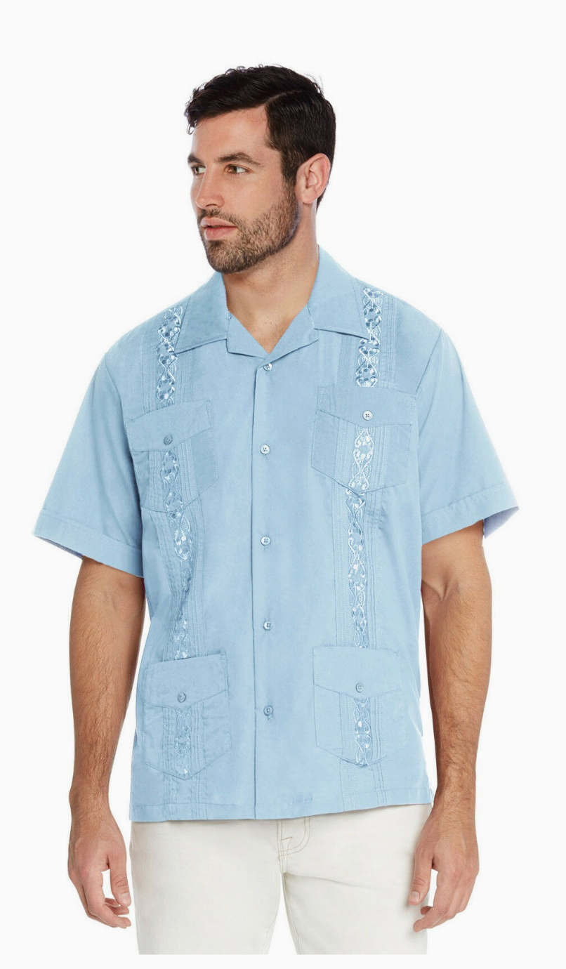 Embrace tradition and sophistication with four front pockets, two rows of pleats on the front and back, intricate embroidery, and decorative buttons. Perfect for beach weddings or casual occasions, this shirt seamlessly blends classic charm with modern flair, ensuring you make a statement wherever you go. Step into timeless elegance with this Guayabera shirt that effortlessly combines comfort and traditional style