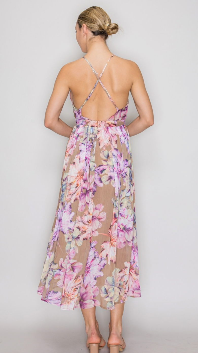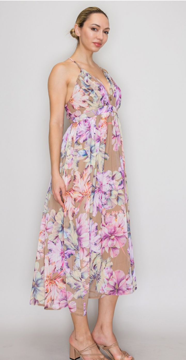This floral print midi dress features an empire waist silhouette with a deep V-neckline and a structured, wide waistband that transitions into a pleated, A-line skirt. The garment is defined by an all-over animal pattern with high-contrast tonal gradients, appearing on a fine-gauge woven surface that is lightweight and non-stretch