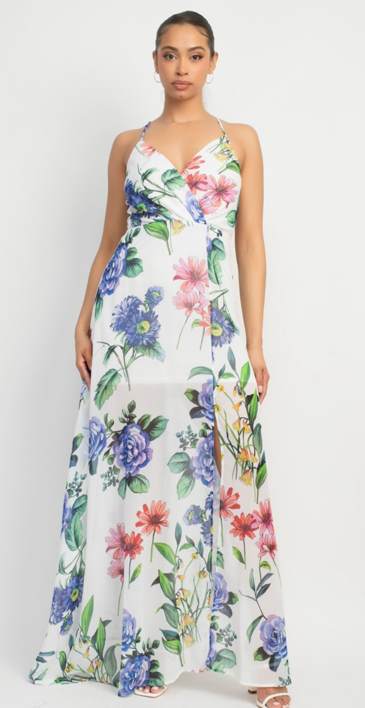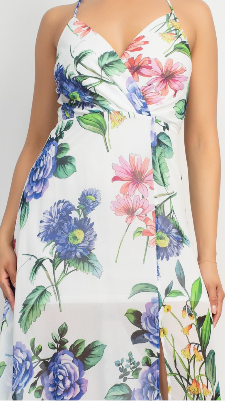 A floral printed chiffon maxi dress that exudes everyday versatility featuring adjustable sleeveless straps, wrap top design, surplice neckline, A-line silhouette, zip-up closure, and a front slit. Made in Cambodia